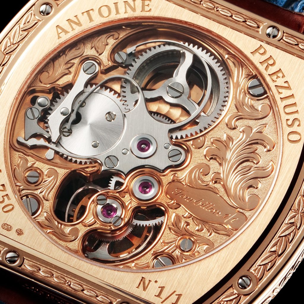 As for « The star of the show » Antoine Preziuso uses a tourbillon movement fully decorated and engraved by hand, in a limited series. Each movement will be a unique interpretation, and an automatic version is in preparation as well.